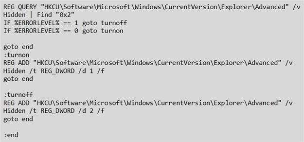 - reg להוסיף "HKCU \ Software \ Microsoft \ Windows \ CurrentVersion \ Explorer \ Advanced" / v Hidden / t REG_DWORD / d 1 / f