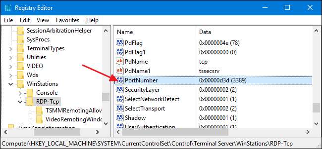HKEY_LOCAL_MACHINE \ System \ CurrentControlSet \ Control \ Terminal Server \ WinStations \ RDP-Tcp \ PortNumber