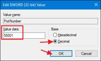 בחלון המאפיינים, בחר באפשרות "עשרוני" ואז הקלד את מספר היציאה שבו ברצונך להשתמש. איזה מספר יציאה תבחר תלוי בך, אך שים לב שחלק ממספרי היציאה כבר נמצאים בשימוש. אתה יכול לבדוק את ויקיפדיה רשימת מטלות נמל נפוצות כדי לראות מספרים שאסור להשתמש בהם, אך אפליקציות רשת המותקנות במחשב שלך עשויות להשתמש ביציאות נוספות. מספרי נמל יכולים להגיע עד 65,535, ואם אתה בוחר במספרי נמל מעל 50,000 אתה צריך להיות די בטוח. לאחר שהזנת את מספר היציאה שבה ברצונך להשתמש, לחץ על "אישור".