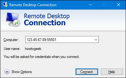 לאחר שתסיים להגדיר את הדברים, אתה אמור להיות מסוגל להיכנס לשולחן עבודה מרוחק דרך האינטרנט על ידי התחברות ל- כתובת IP ציבורית הנתב שלך חושף עבור הרשת המקומית שלך ואחריו נקודתיים ואז מספר היציאה למחשב שאליו ברצונך להתחבר. לדוגמא, אם ה- IP הציבורי שלי היה 123.45.67.89 והייתי מגדיר מחשב עם מספר היציאה 55501, הייתי מתחבר ל "123.45.67.89:55501."