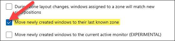 האפשרות שאנו רוצים לאפשר כאן "העבר חלונות שנוצרו לאחרונה לאזור הידוע האחרון". משמעות הדבר היא כי כאשר אתה סוגר חלון באזור מסוים, זה יחזור לאותו אזור כאשר אתה פותח אותו בפעם הבאה.