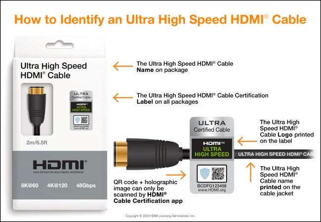 למרות בתקן HDMI האחרון ידוע בשם HDMI 2.1, יש למשגיחים של HDMI בשיטת מתן שמות שונה עבור כבלים. אם אתה רוצה לקנות כבל תואם 2.1-HDMI, אתה צריך לחפש את המילים "מהירות גבוהה Ultra HDMI" על הקופסה.