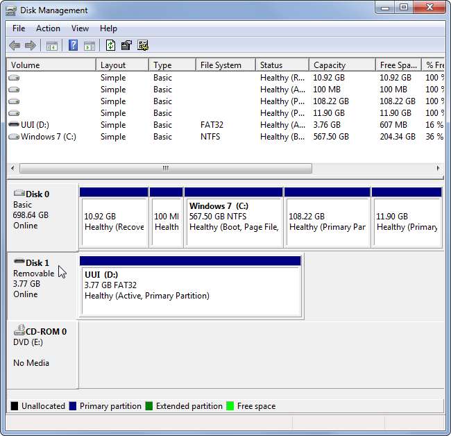 חפש את כונן ה- USB בחלון ניהול הדיסק וציין את מספר הדיסק שלו. לדוגמה, כאן כונן ה- USB הוא דיסק 1.