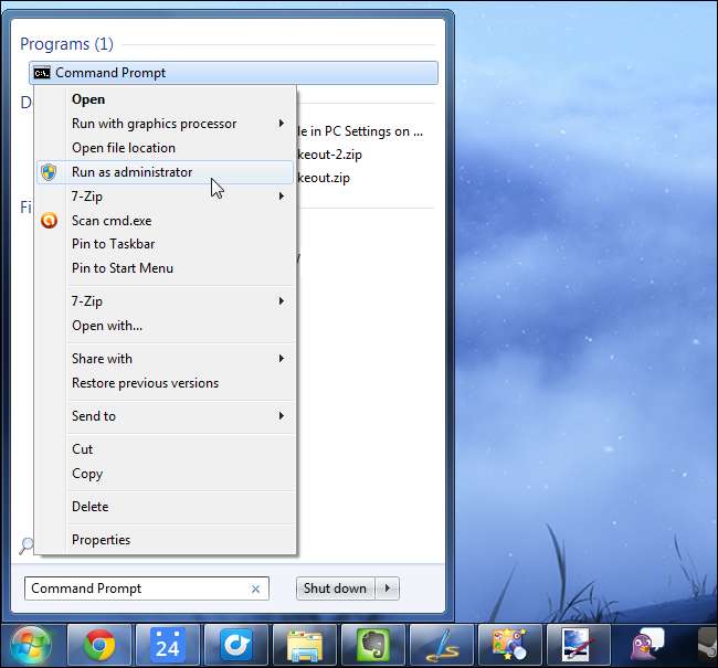 לאחר מכן, פתח את שורת הפקודה כמנהל. ב- Windows 7, פתח את תפריט התחל, חפש את שורת הפקודה, לחץ באמצעות לחצן העכבר הימני על קיצור הדרך של שורת הפקודה ובחר הפעל כמנהל. ב- Windows 8 או 8.1, לחץ על מקש Windows + X ולחץ על שורת הפקודה (מנהל).