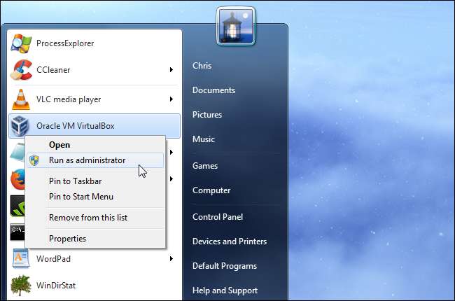 לאחר מכן, פתח את VirtualBox כמנהל. לחץ לחיצה ימנית על קיצור הדרך VirtualBox ובחר הפעל כמנהל. VirtualBox יכול לגשת רק להתקני דיסק גולמיים עם הרשאות מנהל.