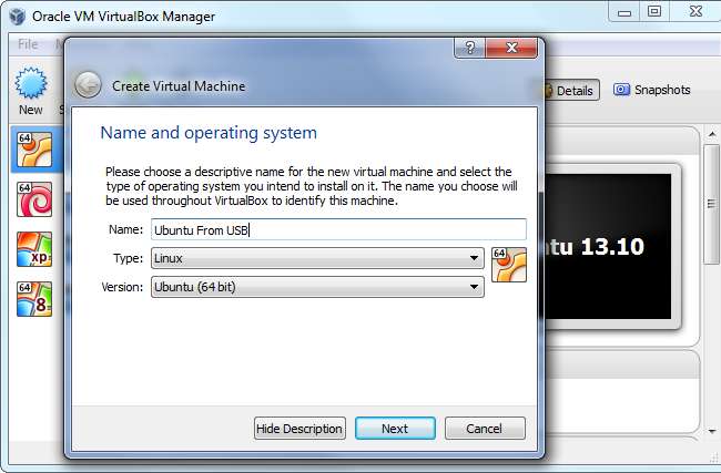 צור מכונה וירטואלית חדשה על ידי לחיצה על כפתור חדש ועבר באשף. בחר את מערכת ההפעלה בכונן ה- USB כאשר תתבקש לעשות זאת.