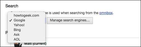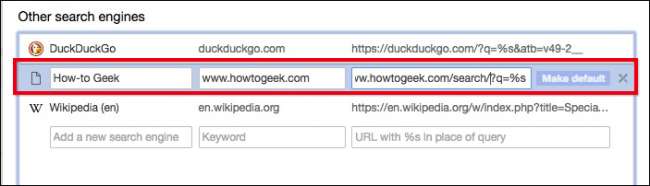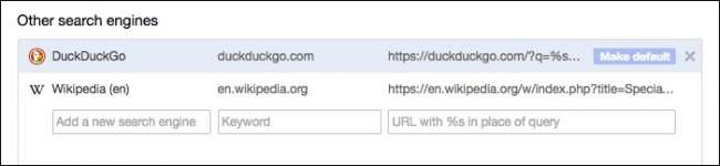 בכל פעם שאתה מבקר באתר חדש עם תיבת חיפוש, הוא יופיע תחת "מנועי חיפוש אחרים" בתחתית. אתה יכול לרחף מעל אחד ממנועים אלה וללחוץ על כפתור "הגדר ברירת מחדל" כדי להפוך אותו למנוע החיפוש המוגדר כברירת מחדל, או לחץ על "X" כדי להסיר אותו.
