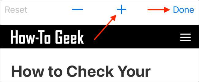 כעת תראה סרגל כלים חדש בחלק העליון של המסך. הקש על הלחצן "+" כדי להגדיל את גודל הטקסט. הלחצן "-" יפחית את גודל הטקסט. באפשרותך לבחור את הלחצן "אפס" כדי לחזור לגודל הטקסט המוגדר כברירת מחדל. לאחר שתסיים התאמה אישית, הקש על הלחצן "Done".
