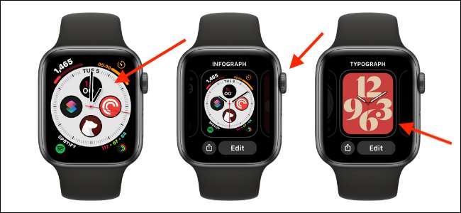 במקום זאת, לחץ והחזק את מסך התצוגה של Apple כדי להיכנס למצב עריכת פנים. כאן, להפוך את הכתר הדיגיטלי לנוע במהירות דרך כל פנים השעון שלך. לאחר מכן, פשוט הקש על השעון פנים שאתה רוצה לעבור.