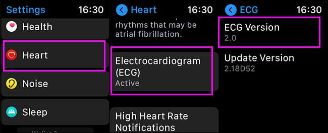 כדי לבדוק איזו גירסה השעון שלך כרגע, פתח את App הגדרות, ולאחר מכן הקש על "הלב", ולאחר מכן "ECG".