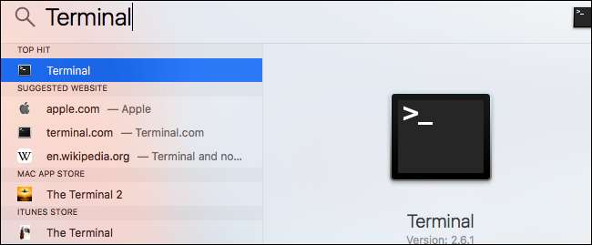 עיכוב ההמתנה הוא אפשרות נסתרת שאינה זמינה בחלון התצורה של חיסכון באנרגיה. כדי לבדוק זאת, יהיה עליך לפתוח חלון טרמינל. אתה יכול לפתוח חלון מסוף על ידי לחיצה על Command + Space כדי לפתוח את שיח חיפוש זרקור , הקלדת "טרמינל" ולחיצה על Enter. לחלופין, פתח חלון Finder ופנה אל Applications> Utilities> Terminal.