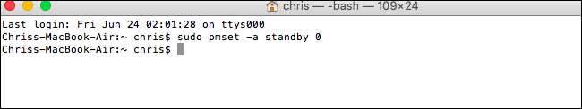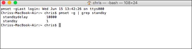 המספר שאתה רואה ליד "standbydelay" הוא כמה זמן ה- Mac שלך ממתין לפני שהוא נכנס למצב המתנה לאחר השינה, תוך שניות. כך, למשל, ערך המתנה המתנה של 10800 בצילום המסך למטה פירושו 10800 שניות. זה 180 דקות, או 3 שעות.
