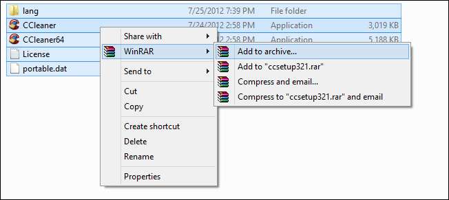 כעת עלינו ליצור ארכיון לחילוץ עצמי - זה יעזור לנו לבצע אוטומטית את CCleaner כאשר הוא מועתק למכונה המרוחקת. כלי הבחירה שלנו הוא WinRAR , למרות שבוני ארכיון אחרים שמוציאים את עצמם עשויים לעבוד. לשם כך בחר את כל הקבצים שחולצו והוסף אותם לארכיון חדש.