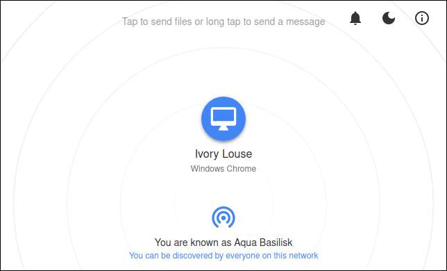 תוכל להקצות שם נוצר על ידי שילוב צבע שנבחר באופן אקראי סוג של חיה. במקרה זה, אנחנו Basilisk אקווה. עד שמישהו אחר מצטרף, אין הרבה שאנחנו יכולים לעשות. כאשר מישהו אחר באותה הרשת פותח את אתר Snapdrop, הן תופענה על המסך.