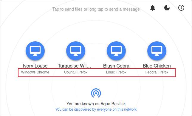 מערכת ההפעלה וסוג הדפדפן מוצגים עבור כל חיבור. לפעמים Snapdrop יכול לזהות את הפצת הלינוקס אדם משתמש. אם הוא לא יכול, הוא משתמש תווית גנריות "לינוקס".