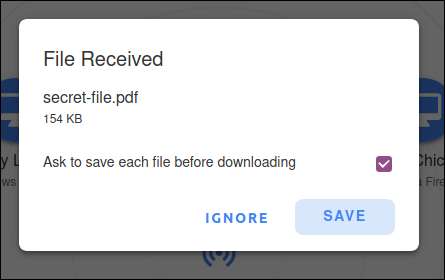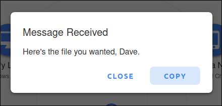 דפדף אל המיקום של הקובץ שאתם רוצים לשלוח ובחרו אותו. אם יש לך קבצים רבים לשלוח, אתה יכול לסמן כמה מהם בבת אחת. לחץ על כפתור "פתח" (הממוקם מחוץ למסך ב צילום המסך שלנו) כדי לשלוח את הקובץ. תיבה "קובץ שהתקבלה" שיח תופיע במחשב היעד ויידע נמען שקובץ נשלח אליהם.