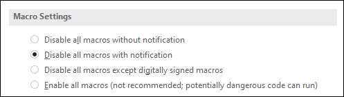 - "השבת את כל פקודות מאקרו, למעט פקודות מאקרו חתומות דיגיטלית": בחירת זה משבית פקודות מאקרו, אך שולחת התראה אבטחה, כך שתדע את המסמך מכיל פקודות מאקרו. עם זאת, זה יפעל מאקרו המכילים חתימה דיגיטלית על ידי בעל אתר מהימן. אם לא סמכת על המו"ל, תקבל התראה.