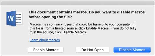 כאשר תנסה לפתוח קובץ Office המכיל פקודות מאקרו ב- Mac, יופיע אזהרת אבטחה לפני שהמסמך נפתח. ההודעה קובעת שהקרו יכול להכיל וירוסים, ואתה צריך רק לאפשר פקודות מאקרו אם אתה בוטח במקור.