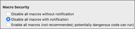 - "השבת את כל פקודות מאקרו ללא הודעה": הגדרה זו משביתה את פקודות מאקרו והתראות אבטחה רלוונטיות.
