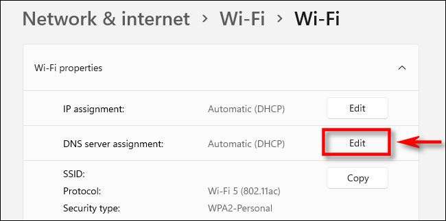 בדף Wi-Fi או Ethernet תכונות החומרה, מצא את האפשרות "שרת DNS הקצאה" ולחץ על כפתור "ערוך" לצד זה.