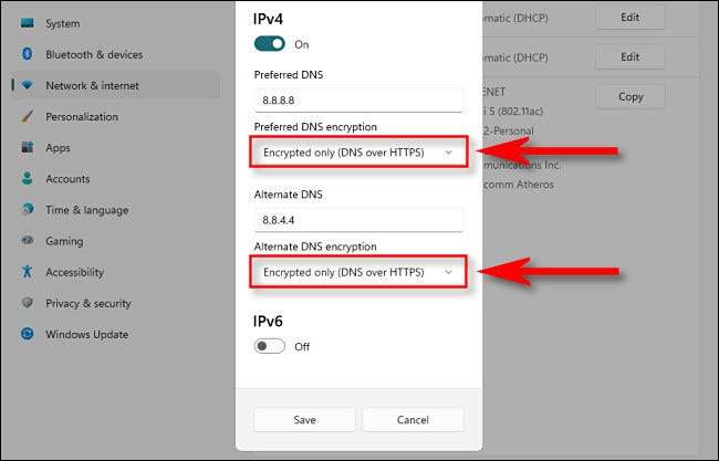 לאחר מכן, הגדר את הגדרות "הצפנת DNS" כדי "מוצפן בלבד (DNS מעל HTTPS)." לבסוף, לחץ על "שמור".