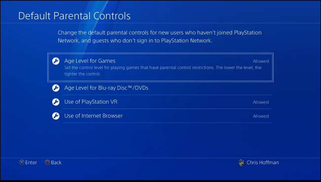 בחר "בקרת הורים המוגדרת כברירת מחדל" כדי לבחור בהגדרות המערכת הכוללת אורחים שאינם נכנסים לחשבונות משתמש חדשים. ניתן להגדיר רמות גיל נפרדות למשחקים ודיסקי Blu-ray / DVD. אתה יכול גם לבחור אם משתמשי אורח יכולים להשתמש ב- PlayStation VR או לגשת לדפדפן האינטרנט של הקונסולה.