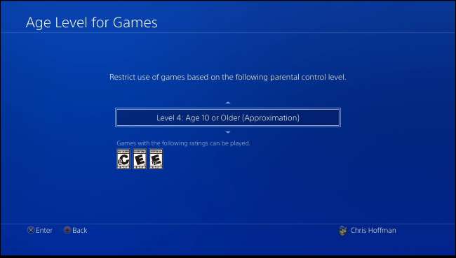 לאחר שהוספת חשבון משתמש חדש, תוכל לבחור רמת גיל למשחקים ורמת גיל לתקליטורי וידאו עבור אותו חשבון. אתה יכול גם לבחור אם אותו משתמש יכול להשתמש בדפדפן האינטרנט או ב- PlayStation VR.