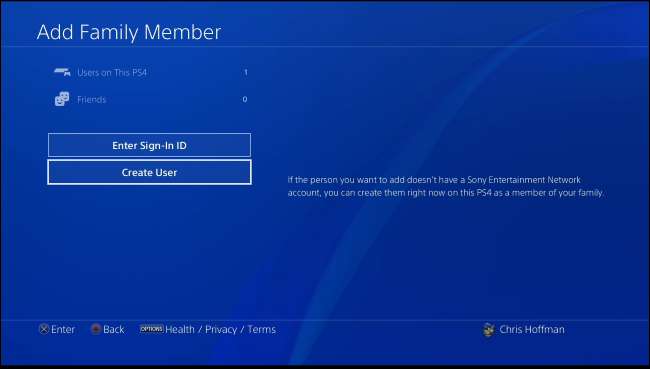 לאחר הכניסה תופיע המסך "הוסף בן משפחה". תוכל להוסיף חשבון משתמש קיים ב- PlayStation 4 למשפחה שלך, להוסיף חשבון משתמש מרשימת החברים שלך, להזין את פרטי חשבון PlayStation Network של חשבון המשתמש או ליצור חשבון משתמש - שיכול להיות חשבון משתמש מקומי ללא PSN. חֶשְׁבּוֹן.