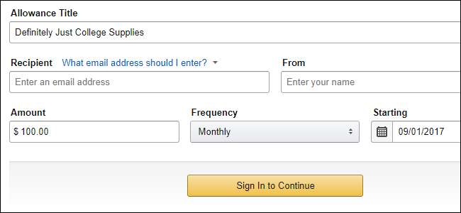 תכונת הקצבה של אמזון מחייבת את כרטיס האשראי שלך מדי חודש ואז שולחת את הסכום שתבחר לחשבון אמזון של מישהו אחר. זה מושלם לתת לילדים שלך כסף בזמן שהם נמצאים בבית הספר, אבל אתה יכול להשתמש בו עם כל חשבון שאליו אתה שולח כסף באופן שגרתי (אם השותף שלך לחדר מבצע קניות באינטרנט, למשל).