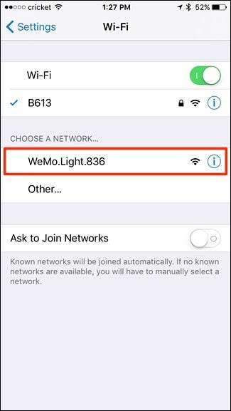התחבר לרשת האלחוטית של מתג האור WeMo, שייראה כמו "WeMo.Light.xxx". הקש עליו כדי לחבר את הסמארטפון למתג האור.
