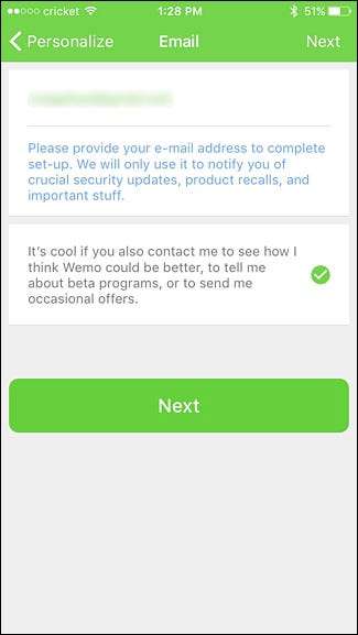 במסך הבא, הזן את כתובת הדוא"ל שלך והאם ברצונך לקבל הצעות ומידע אחר אודות מוצרי WeMo. הכה "הבא".