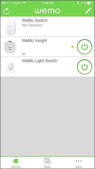 לאחר מכן, תוכל להתחיל לשלוט על מתג האור WeMo מהסמארטפון שלך על ידי הקשה על כפתור ההפעלה מימין. כאשר הוא נדלק בירוק, המשמעות היא שהמתג מופעל.