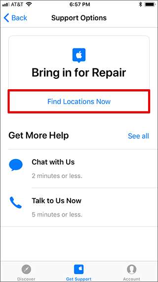 אפשרות התמיכה המומלצת שלך תוצג בחלק העליון של המסך. מתחת לבאנר הכניסה לתיקון, הקש על הלחצן "מצא מיקומים עכשיו".