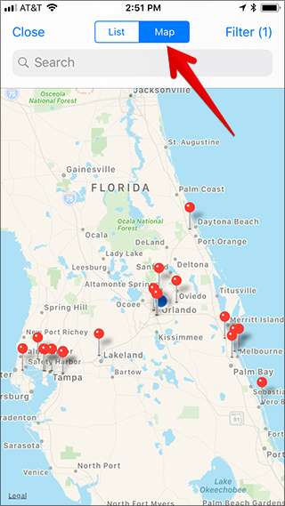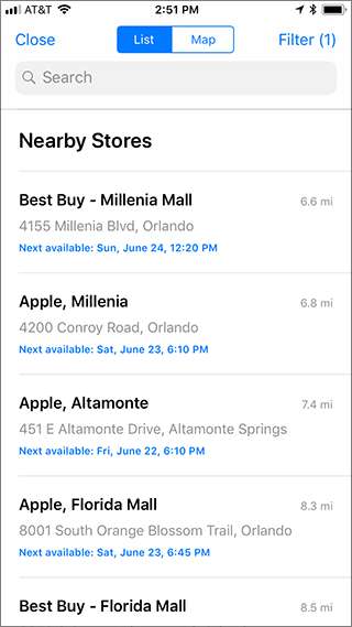 אתה יכול גם להקיש על כפתור "מפה" בחלק העליון של המסך כדי לראות מיקומים בקרבת מקום בחנות Apple Store במפה.