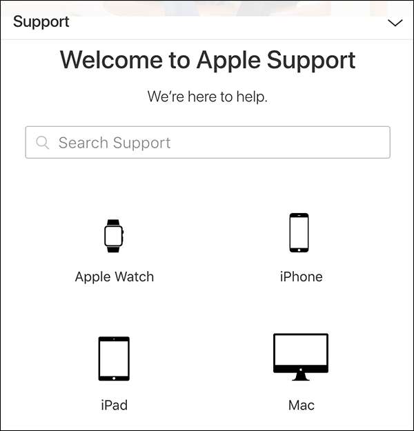 פתח את הדפדפן שלך ועבור אל אתר התמיכה של אפל . הקלד את בעיית התמיכה שלך בשורת החיפוש, או לחץ על המכשיר או השירות שאתה זקוק לו לעזרה.
