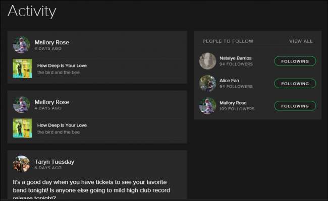 אם נרשמת ל- Spotify באמצעות הדוא"ל שלך בלבד, המקום היחיד ש- Spotify תנסה לשתף הוא בתוך האפליקציה עצמה. כשאתה יוצר את הפרופיל שלך, תראה שיש לך גם "עדכון" שנותן לכל אחד עם שם הפרופיל שלך את היכולת לראות מה אתה מנגן עכשיו כמו גם את 20 השירים האחרונים שהיו ברשימת ההשמעה.