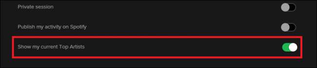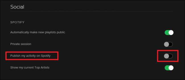 לאחר מכן, גלול מטה לקטע "חברתי", שם תראה את כל אפשרויות השיתוף הזמינות שלך. ישנן שתי דרכים לנהל מי רואה מה בחשבון Spotify: אתה יכול לכבות את המתג "פרסם את הפעילות שלי ב- Spotify" כפי שמודגש למטה, או להפעיל את מה שהחברה מכנה "מושב פרטי".
