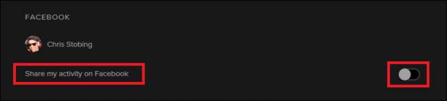 לאחר מכן, מצא את הקטע "פייסבוק" ממש מתחת לכך, והפעל את המתג "שתף את הפעילות שלי בפייסבוק" למצב כבוי. ניתן להשיג את אותו אפקט גם אם תשבית את Spotify מפרסום מטעמך בהגדרות הפייסבוק שלך, אם כי אנו לא ממליצים ללכת בדרך זו מכיוון שזה לא מאפשר לשתף שיר עם חברים כאשר אתה מעוניין לפרסם אותו בפניך ציר זמן.