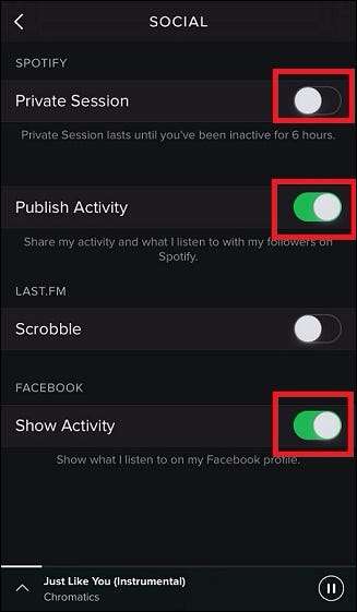 ברגע שבתפריט זה, תראה את אותם שלושת החלפים המטפלים באופן שיתוף פעילות המוסיקה שלך ולאיזו פלטפורמה. פשוט השבת את המתגים שאתה לא רוצה לשמור עליהם, וסיימת!