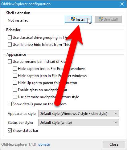 לאחר מכן, בתיבת הדו-שיח תצורת OldNewExplorer, לחץ על "התקן" במקטע הרחבה של מעטפת. זה מאפשר להחיל את ההגדרות בתיבת דו-שיח זו על סייר הקבצים כאשר אתה בוחר בהן.