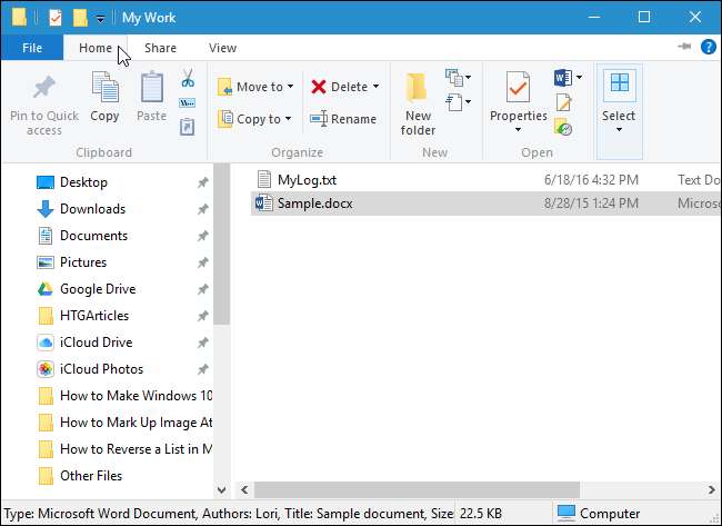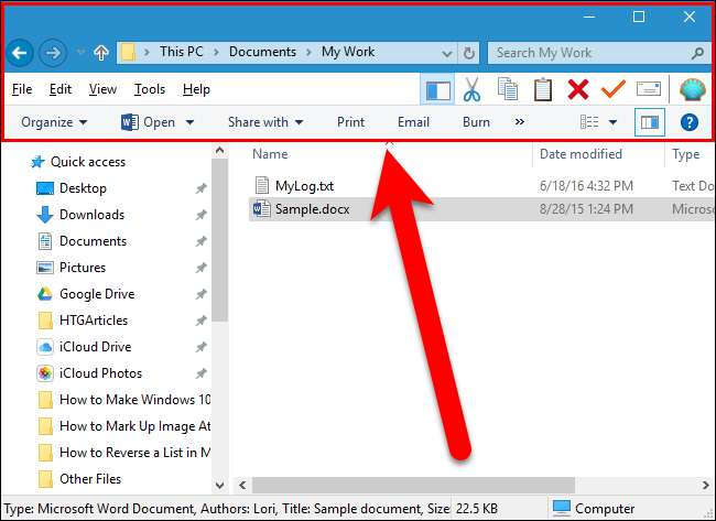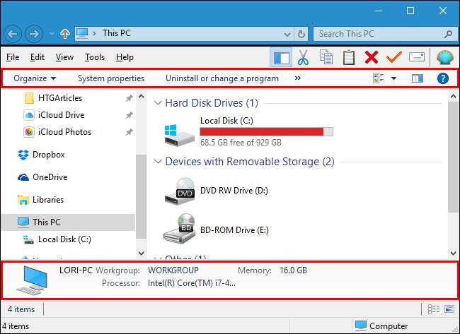 סייר Windows של Windows 10 חסר גם שורת מצב, המוצגת בדרך כלל מתחת לחלונית הפרטים.