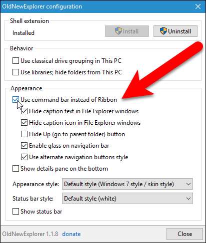 אם אינך אוהב את הסרט, תוכל להשבית אותו ולהשתמש במקום זאת בשורת הפקודה מ- Windows Explorer. לשם כך, סמן את התיבה "השתמש בשורת הפקודה במקום רצועת הכלים" בקטע מראה בתיבת הדו-שיח תצורה של OldNewExplorer.