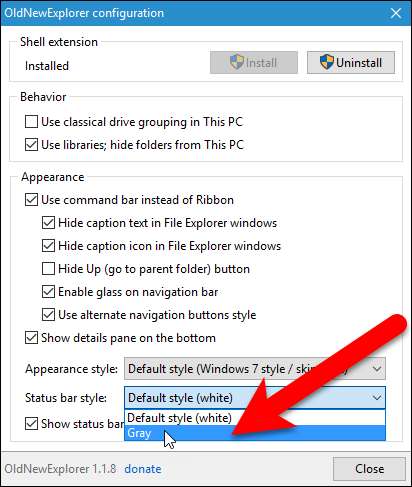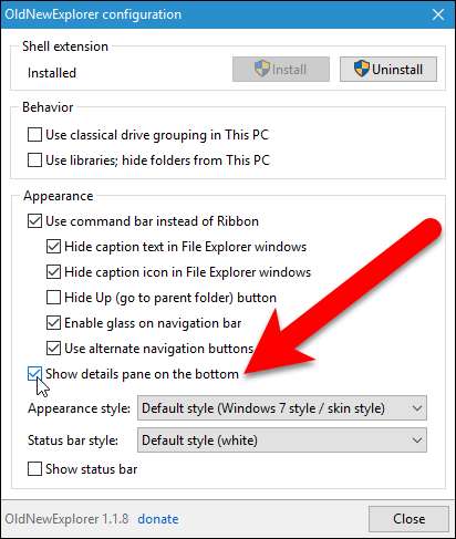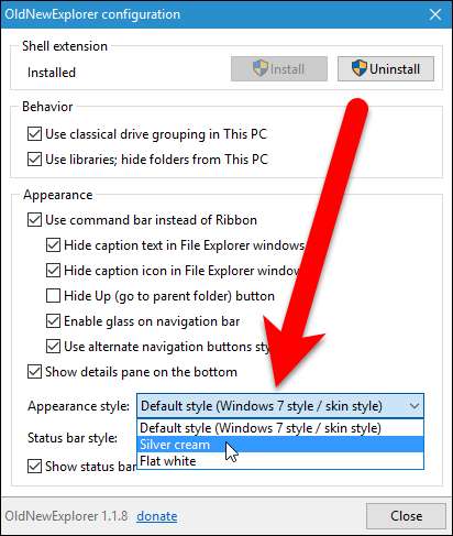 OldNewExplorer גם מאפשר לך לשנות את המראה של סרגל האפשרויות מעל רשימת הקבצים ואת חלונית הפרטים. לשם כך חזור לתיבת הדו-שיח תצורה של OldNewExplorer (או פתח אותה שוב) ובחר אפשרות מתוך הרשימה הנפתחת "סגנון מראה" בקטע מראה.