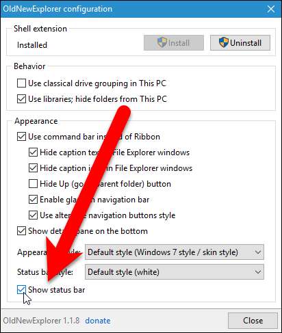 כדי להפעיל את שורת המצב, סמן את התיבה "הצג שורת מצב" במקטע מראה בתיבת הדו-שיח תצורה של OldNewExplorer.