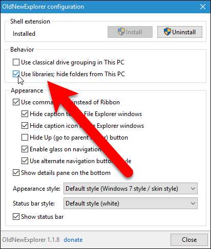 כדי להחזיר את הספריות ולהסיר את קבוצת התיקיות, סמן את הסימון "השתמש בספריות; הסתר תיקיות ממחשב זה ”בקטע התנהגות בתיבת הדו-שיח תצורה OldNewExplorer.