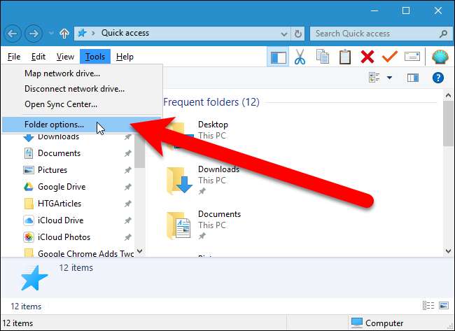 אם ברצונך לגרום לרשימת הגישה המהירה להתאים יותר לרשימת המועדפים הישנה, עליך להסתיר את התיקיות הנפוצות מרשימה זו. לשם כך, אינך זקוק ל- OldNewExplorer (נחזור להשתמש בזה). אנו הולכים לשנות הגדרה בסייר הקבצים. אם החלפת את הסרט בשורת הפקודה (בסעיף "השבת את רצועת סייר הקבצים ושנה את מראה סרגל הניווט" לעיל), בחר באפשרות "אפשרויות תיקיה" מתפריט "כלים".