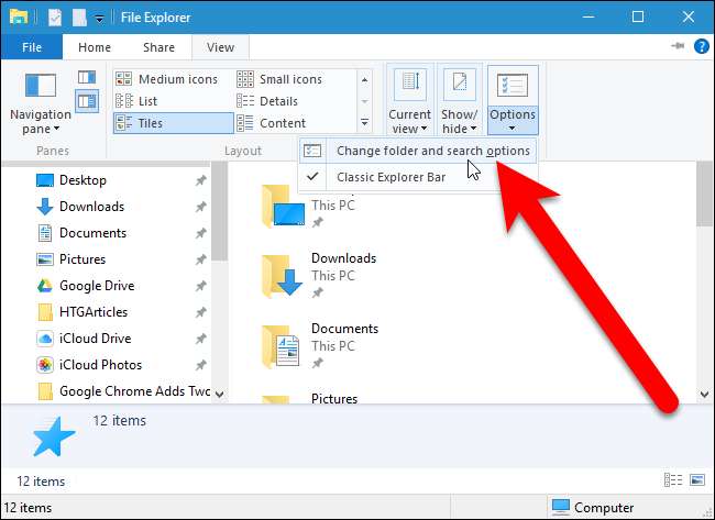 אם אתה עדיין משתמש בסרט, לחץ על הכרטיסייה "תצוגה". לאחר מכן, לחץ על החץ למטה על כפתור "אפשרויות" ובחר "שנה אפשרויות תיקייה וחיפוש".