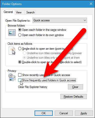 אם ברצונך להציג שוב תיקיות בשימוש תכוף ברשימת הגישה המהירה, סמן את התיבה "הצג תיקיות בשימוש תכוף בגישה מהירה" בקטע פרטיות בכרטיסיה כללי בתיבת הדו-שיח אפשרויות תיקיה. אתה יכול גם לחזור לפתיחת סייר הקבצים לגישה מהירה ולא למחשב זה על ידי בחירת "גישה מהירה" מהרשימה הנפתחת "פתח את סייר הקבצים אל" בכרטיסייה כללי בתיבת הדו-שיח אפשרויות תיקיה.