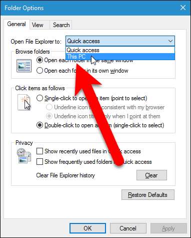 כברירת מחדל, סייר הקבצים ב- Windows 10 נפתח לתצוגת הגישה המהירה. עם זאת, אם אתה מעדיף לפתוח את סייר הקבצים למחשב זה במקום זאת, בחר באפשרות "מחשב זה" מהרשימה הנפתחת "פתח סייר קבצים ל" בכרטיסיה כללי בתיבת הדו-שיח אפשרויות תיקיות שפתחנו בחלק האחרון.