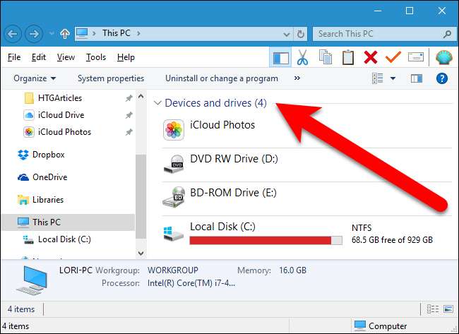 ב- Windows 10, כל הכוננים תחת מחשב זה מופיעים בהתקנים ובכוננים ללא קיבוץ מיוחד. ב- Windows 7, רשימת המכשירים והכוננים נקראה מחשב ורשימה זו הופרדה לקבוצות, כגון כונני דיסק קשיח, התקנים עם אחסון נשלף ומיקום רשת.